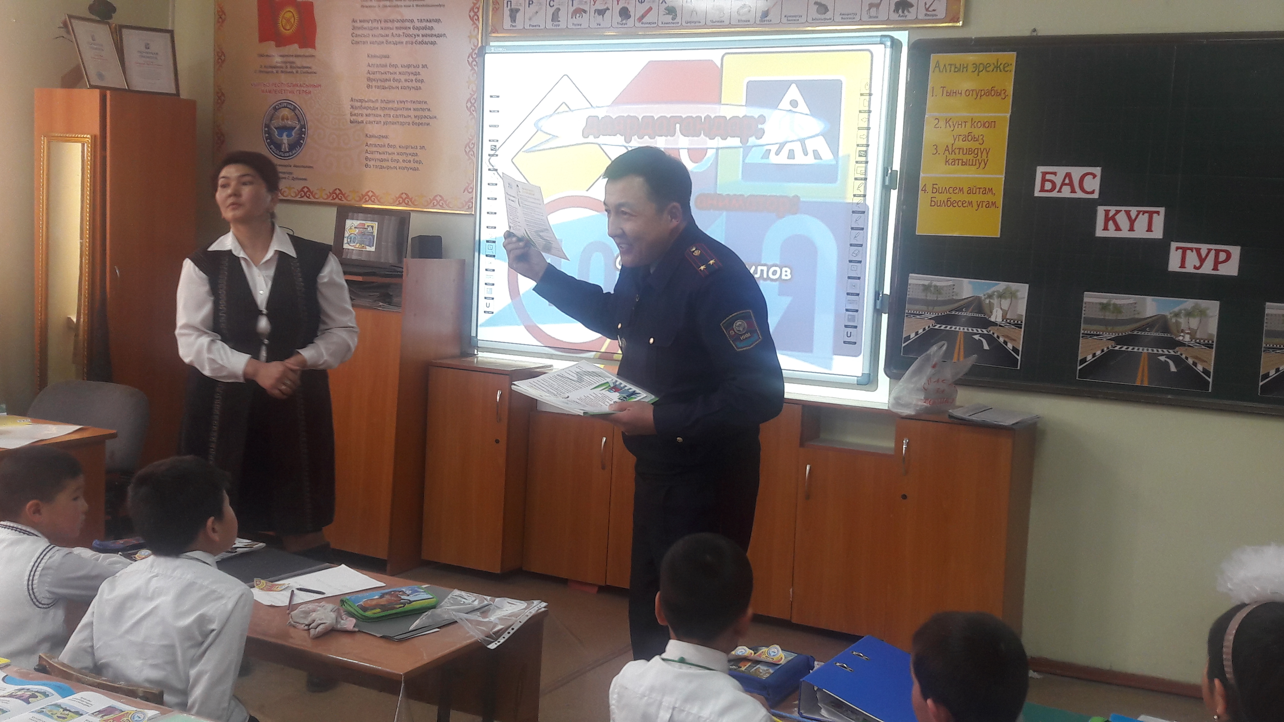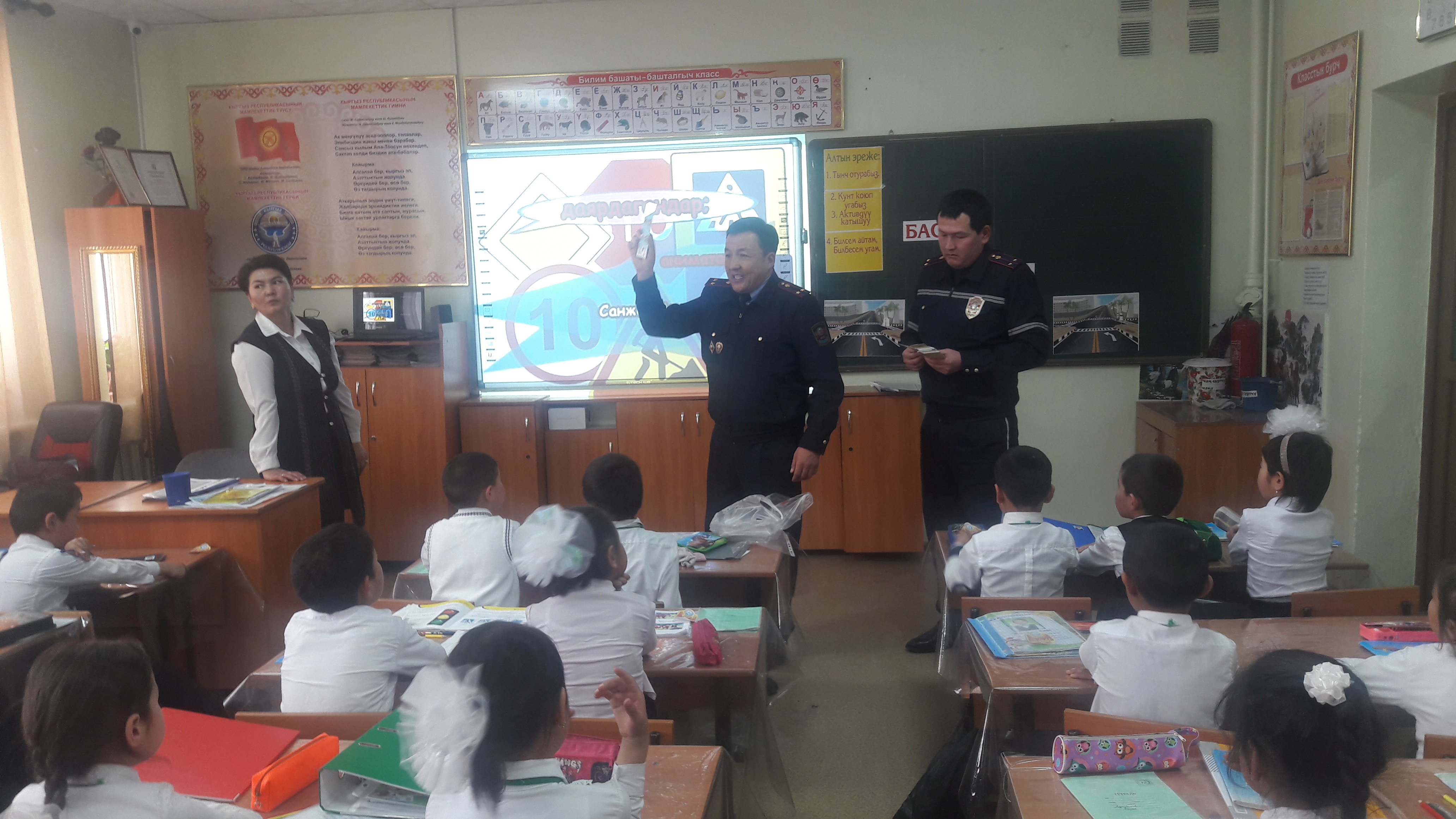 В целях предупреждения дорожно-транспортных происшествий и снижения детского дорожно-транспортного травматизма 24 января 2018 года сотрудниками штаба УОБДД по г. Бишкек на базе средней школы №81 г. Бишкек был организован и проведен открытый урок по Правилам дорожного движения ученикам 1 – класса данной школы.